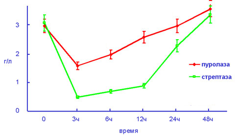 Концентрация фибриногена при применении Пуролазы существенно не изменяется в отличие от тромболитика 1-го поколения Стрептокиназы (СК), использование которой сильно снижает уровень фибриногена и часто приводит к геморрагическим осложнениям