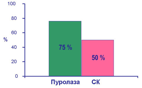 Эффективность тромболитической терапии при использовании Пуролазы на 50% выше, чем у самого распространенного тромболитика 1-го поколения Стрептокиназы (СК).